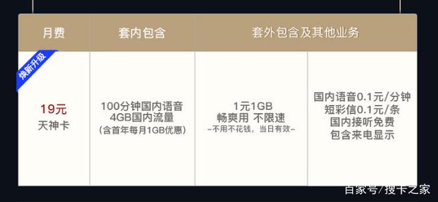 微信、QQ、腾讯视频、快手、王者荣耀、和平精英、QQ音乐、应用宝、快手、腾讯地图、微视、新浪微博等等上百余款APP 注:当月套餐应用专属流量使用达到30GB后,超出部分将按照套外流量计费。 2、新天神卡19元/月,100分钟通话+4GB流量(含首年每月1G)+1元1GB国内流量