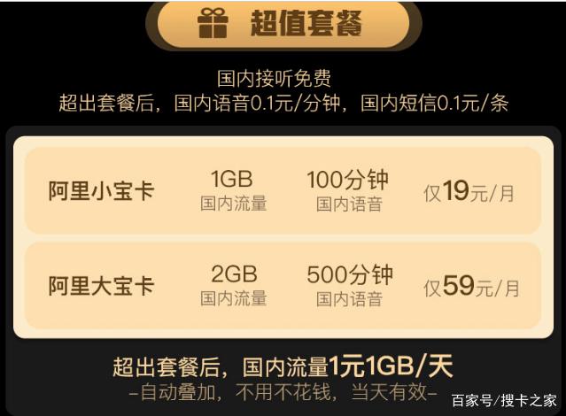 福利详情:天神卡入网当月起连续12个月套餐内每月含1GB优惠,可添加5个亲情号。 注:当月总流量使用达到40GB后,系统将关闭上网功能,次月自动打开;用户也可以自助打开数据网络,打开后仍然按上述收费。 3、阿里宝卡19元/月,阿里系免流+国内1G流量+100分钟